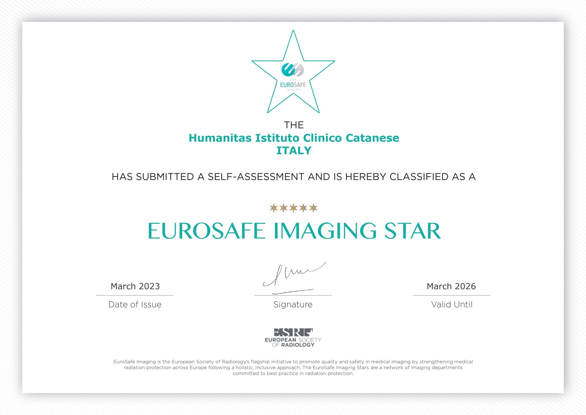 Humanitas Istituto Clinico Catanese ha ottenuto un prestigioso riconoscimento nell’ambito del programma EuroSafe Imaging Stars promosso dalla Società Europea di Radiologia. Si tratta di un’iniziativa nata per individuare e dare riconoscimento alle strutture di tutto il mondo che attuano le migliori pratiche in materia di radioprotezione per i pazienti sottoposti ad esami di imaging radiologico. La sinergia tra i servizi di Fisica Sanitaria e Radioprotezione e di Radiologia ha permesso di ottenere 5 stelle, migliorando il precedente risultato di Luglio 2019. Ad oggi, in Italia, sono solamente 13 le strutture sanitarie che hanno ottenuto questo importante riconoscimento.