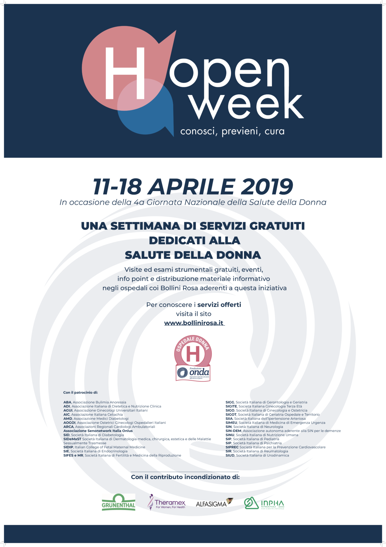 “Questa iniziativa, nata in occasione dell’istituzione della Giornata Nazionale sulla Salute della Donna, è giunta alla quarta edizione e rappresenta uno degli appuntamenti che mi sta più a cuore tra quelli promossi da Onda nel corso dell’anno”,dichiara Francesca Merzagora, Presidente Onda. “Hanno aderito oltre 190 ospedali con i Bollini Rosa in tutte le regioni italiane; i Bollini Rosa, da 10 anni sono un esempio concreto di applicazione di una medicina genere-specifica in ambito ospedaliero e sono ormai 306 su tutto il territorio”.